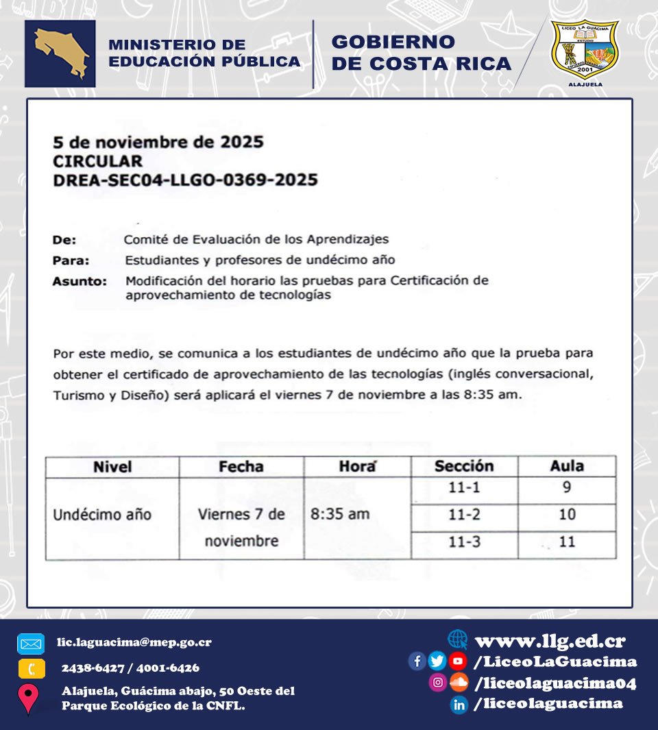 DREA-SEC04-LLGC-369-2025Descarga Navegación de entradas DREA-SEC04-LLGC-365-2025 – Modificación de horario por participación en desfile de la banda estudiantil – viernes 07/11/2025 DREA-SEC04-LLG0-370-2025 – Convocatoria Novenos 7-11-2025